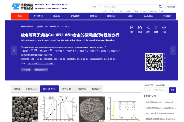 研究表明,采用放电等离子烧结技术制备Cu-6Ni-6Sn合金,完全消除了传统铸造存在的枝晶偏析现象,获得了成分均匀的显微组织。