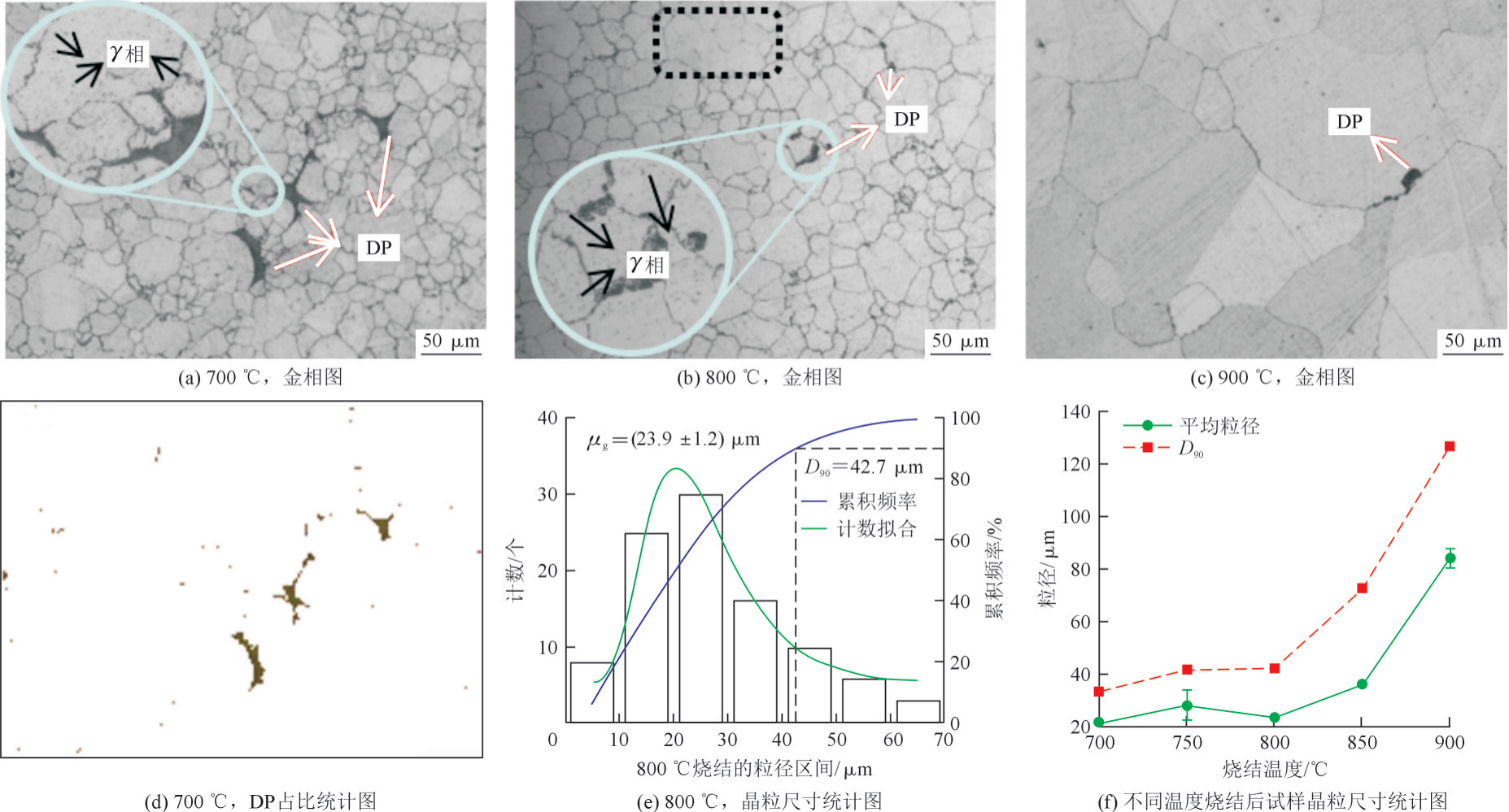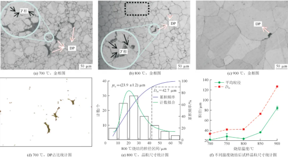 烧结后试样金相图、DP 统计图及粒径统计
