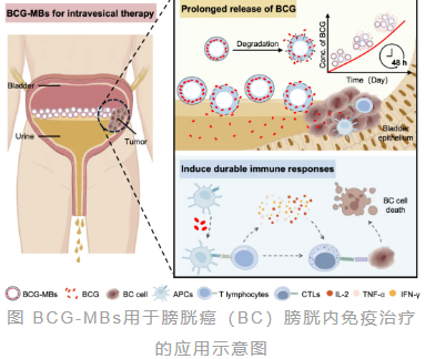 在生物学验证中,该系统展现出巨大优势。体外实验证明,BCG-MBs在尿液中能保持超过50%的漂浮率长达24小时,并持续释放活性BCG。在原位膀胱癌大鼠模型中,与传统BCG灌注组相比,单次BCG-MBs治疗即可实现显著且持久的抗肿瘤效果:完全抑制肿瘤生长、维持动物体重、并实现100%的生存率。其作用机制在于能持续激活更强的Th1型免疫反应,关键细胞因子如IL-2水平显著升高。