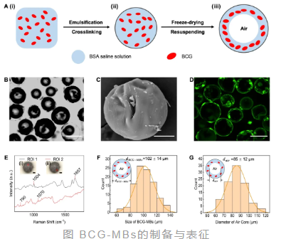 研究团队通过乳化、交联与冷冻干燥技术制备了这种三层结构(空气核心、中间溶液层和外层壳)的微球,并使用泽攸科技ZEM系列台式扫描电镜对其进行了关键的表征。扫描电镜图像清晰展示了微气泡的规则球形结构以及BCG在表面的分布状态,证实了制备的成功。