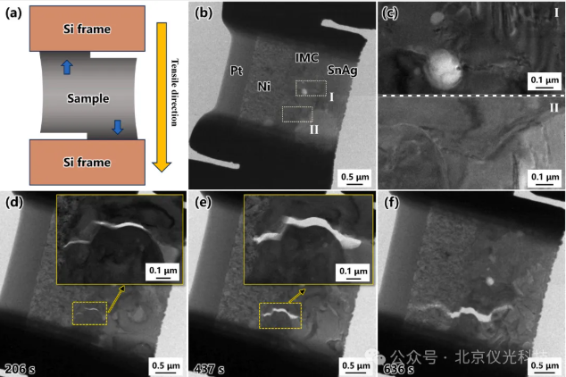在拉伸载荷下,Ni/SnAg界面展现出独特的“空洞生长-聚结-界面开裂”失效模式。原位TEM观察显示,IMC/SnAg边界处预先存在的Kirkendall空洞在载荷作用下显著扩展,随后相互连接形成连续裂纹路径。