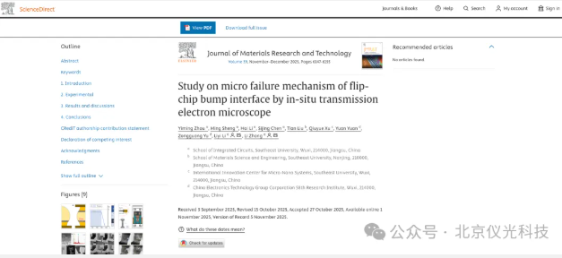 东南大学研究团队利用泽攸科技原位TEM测量系统,开展了针对倒装芯片凸点界面微观失效机制的突破性研究,其成果已在Journal of Materials Research and Technology期刊发表。