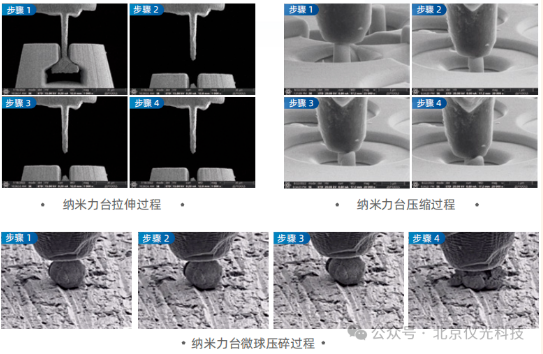 泽攸科技纳米力学台案例图:展示纳米力台在拉伸、压缩和微球压碎过程中的应用