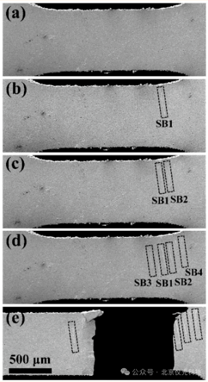 利用泽攸科技原位SEM对金属玻璃在不同拉伸加载阶段的图像观察,显示剪切带的阻挡情况