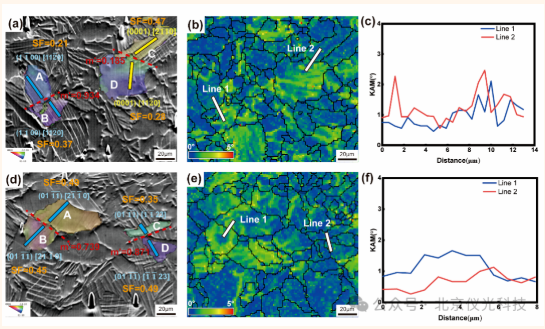 更深入的研究还揭示了Ti65合金在室温(a-c)和高温(d-f)拉伸测试过程中,两组选定晶粒之间的滑移传递行为差异。