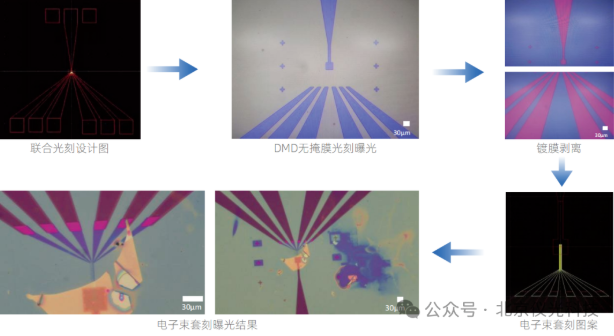 在这种策略下,先用无掩膜光刻高效加工大面积的微米级基础结构(如电极焊盘、引线),再用电子束光刻精雕细琢关键区域的纳米级特征(如量子点、纳米线间隙)。这种组合兼顾了加工效率和极致精度,是制备复杂多功能器件的有效途径。