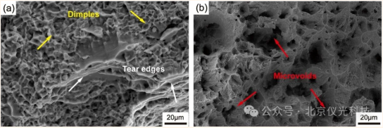 利用泽攸科技原位SEM对Ti65合金进行拉伸测试:(a) 室温拉伸测试的断裂表面;(b) 高温拉伸测试的断裂表面